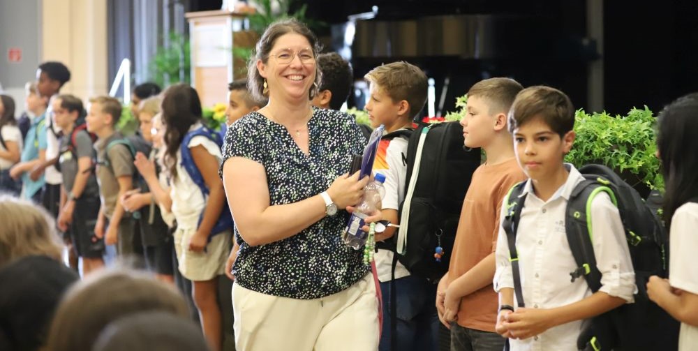 Dass die Älteren für die Jüngeren da sind, erfahren die sechs neuen fünften Klassen direkt im Saal. Denn Neuntklässlerinnen und Neuntklässler begleiten sie als Mentoren in ihren Klassenraum. Sie werden mit Spielideen die Klassengemeinschaft fördern, auf dem Schulhof für sie ansprechbar sein. Die Fürsorge für andere haben sich auch die Schulsanitäterinnen und -sanitäter auf die Fahne geschrieben. Sie überwachen an diesem Tag den sicheren Weg zum Schulhauseingang.
