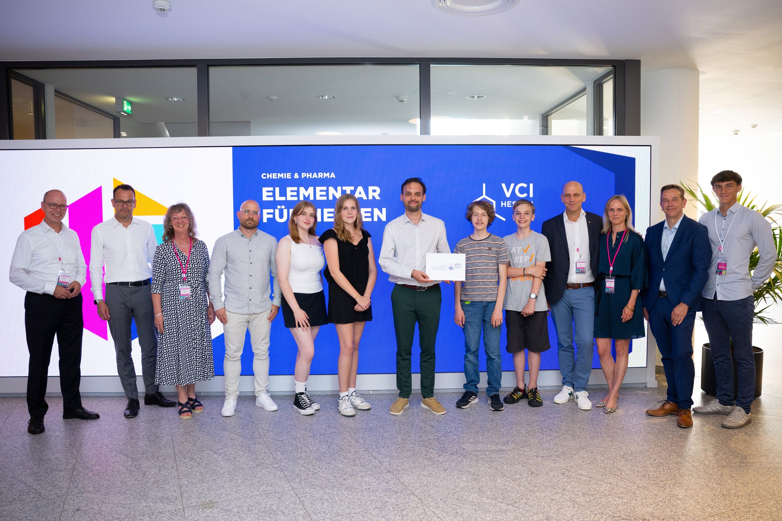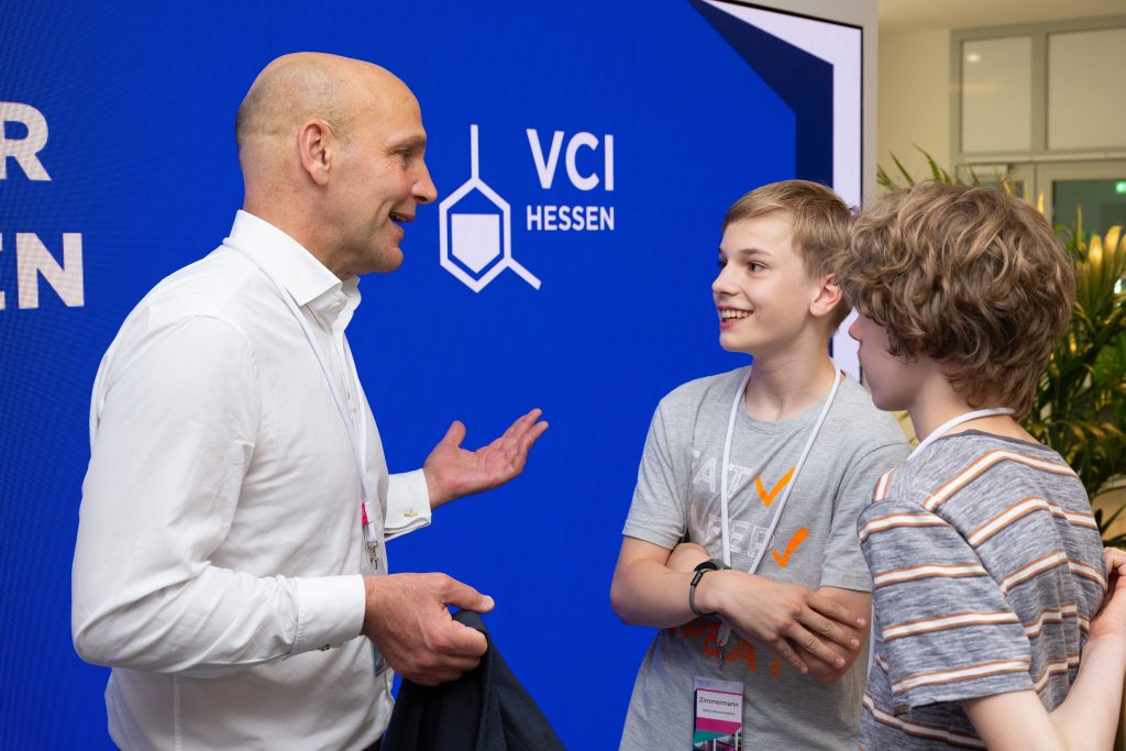 Zuvor konnten die Schülerinnen und Schüler sowie deren Lehrkräfte vom Landesvorsitzenden des VCI Hessen Dr. Joachim Kreysing und Ministerpräsident Boris Rhein in einer Veranstaltung des VCI-Hessen erfahren, welche wichtige Rolle die chemische Industrie in Hessen spielt. Die Schulen nahmen wichtige Impulse, wie man für Naturwissenschaften begeistern kann, vom Chemie-Nobelpreisträger und Direktor am Max-Planck-Institut für Kohlenforschung Prof. Benjamin List sowie vom Unternehmen Merck mit. Besonders beeindruckt zeigten sich die Schülerinnen und Schüler sowie die Lehrkräfte vom anschaulichen Vortrag des Chemienobelpreisträgers, der selbst aus Frankfurt kommt. Spontan kam er am Ende auch noch mit den Schülern am Rande eines Fototermins ins Gespräch. Die Lehrkräfte der Leibnizschule dankten dem VCI und Provadis für die bisher bereits gute Kooperation und freuten sich über die kommenden Gemeinschaftsaktionen.